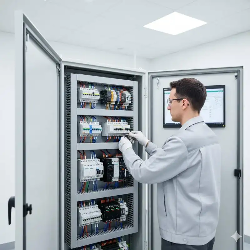 O painel de automação industrial pode conter Controladores Lógicos Programáveis (CLPs), IHMs (Interfaces Homem-Máquina), sensores e diversos módulos de comunicação.